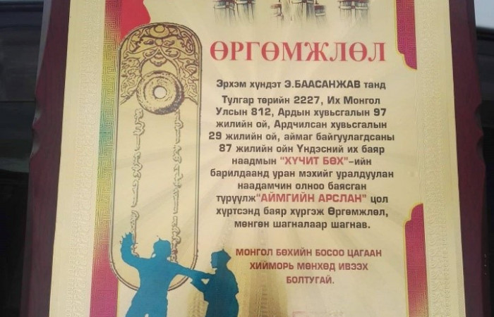 The company awarded Baasanjav Enkhtur with honor and prize money who won the wrestling event of the National Naadam Holiday was commemorating the 2227th anniversary of Foundation of the first Mongolian State, the 812th anniversary of the founding of the Great Mongol Empire, 97th anniversary of the Mongolian People’s Revolution and 87th anniversary of the establishment of Khuvsgul province.